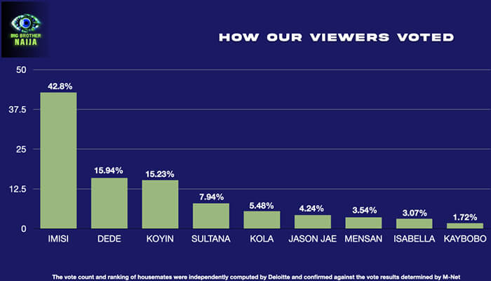 The voting table was an emotional rollercoaster, with Imisi clinching 42.8% of the votes. Dede came in hot as the runner-up, while Koyin secured the third spot. Let’s keep it real, the support for these housemates was wild! Cheers to everyone who voted tirelessly for their faves.